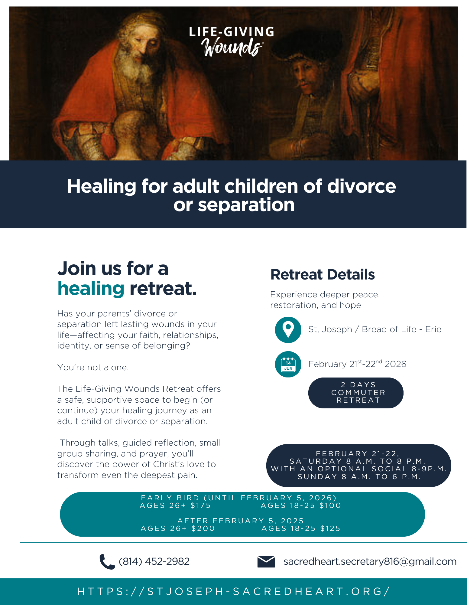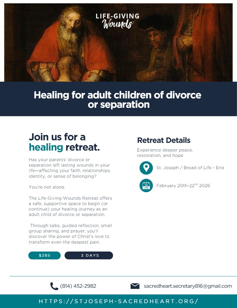 The Life-Giving Wounds retreat is a three-day retreat for young adults and adults with divorced or separated parents. It invites participants to move through the broken image of love that appeared to them in their parents’ relationship to their deepest identity found in God. The retreat gives participants a greater understanding of the wound of divorce and the ways it affects their lives, offers advice about the difficulties concerning love and trust of others, and explains how the Catholic faith, spiritual practices, and the Sacraments are essential to self-knowledge and healing. This retreat has something for any adult child of